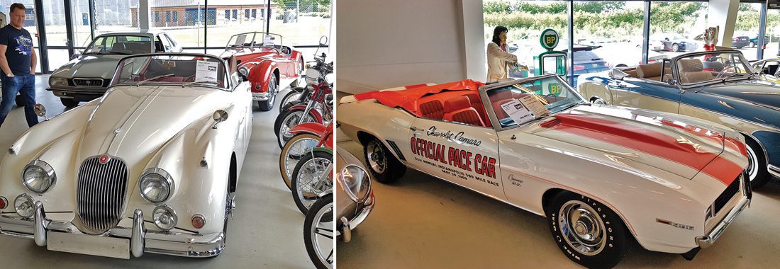 Vi kom oss vestover til Ans, og stedets Mekka for bilentusiaster, CC Cars, ble besøkt. Det er i særklasse Skandinavias største og beste utsalg av veteranbiler, med over 150 på lager. BMW Jaguar, Mercedes, MG og Porsche er merkene de fokuserer på. Min sjåfør berømmer stedet for svært stor variasjon i sortementet. Det var utrolig rent, velholdt og alle bilene var strøkne. Prismessig ville det være dumt å falle for fristelsen her. Høye danske priser med dårlig norsk kronekurs. Utrolig nok fikk man ikke fratrekk i den danske omsetningsskatten og ville måtte betale dobbel moms. Det var også mulig å kjøpe litt bilrekvisita som f eks en sjarmerende britisk piknikkoffert med porselenservice, for de som måtte ha større bagasjerom en vi er utstyrt med. Nå var vi distansemessig ikke langt unna dagens mål, Silkeborg. Vi hadde hatt behagelig kjøring gjennom kornåkrer, langsmed hager med bugnende rododendron og små hus med sjarmerende tilbud på poteter og annet. Syklister er det påtagelig flere av i Danmark, og innimellom ble vi støyende forbikjørt av tohjulinger overdynget av kubikk. Pulsen er lav i vår lille kortesje så lenge man driver ute på bondelandet. Eneste avvik er når en i følget plutselig vrenger ut på en liten avkjøring og stormer bak en busk. Det er klart at her er det én som har fundert lenge på om han skal ødelegge flyten i kjøring eller ei. Men må man, så må man! Rom var reservert på Gl Skovridergaard Hotel litt utenfor det verste maset i Silkeborg. Rart å havne i trafikk og bymiljø igjen. Midt i sentrum måtte man krysse toglinje med bom og plinging. Her ble kortesjen splittet, men heldigvis er Google Maps oppfunnet, og man blir geleidet svært detaljert frem. Navigasjonen i våre klassiske biler er ofte til å bli sprø av. Lite brukervennlige og selvfølgelig ikke oppdaterte på dagens veisystem.