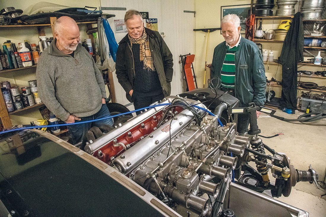 Doc i aksjon i sine yngre dager med selvbygget bil.På garasjebesøk i Halden. Doc t.v. viser fram oppsettet av XK-motoren i en C-type replica til Gunvald Øyna og Fred Ljone fra klubben.