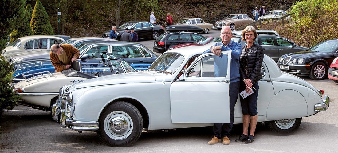 Tradisjonen tro kom vi sammen for å nyte synet og lyden av våre Jaguarer på Holmen Fjordhotell 1. mai. På bildet ser vi Bård Hanssen og Kari Kjørnæs med sin 1956 Jaguar Mark I, en sjelden og fin bil som vi viser fram som et godt eksempel på den gode stemningen. Mange hadde husket å lade batteriet, sjekke oljen og lufttrykket i dekkene – og gitt katten litt puss. Allerede da klubbflagget ble heist kl 12.00 var det bortimot fullt på bilparkeringen, og selv om vi ikke har nøyaktig tall – så var årets oppmøte blant de beste i vår 27-årige historie for Vårmønstringen. Bildereportasjen finner du i Jaguaren 2–2019, som vil komme ut rundt 17. mai.